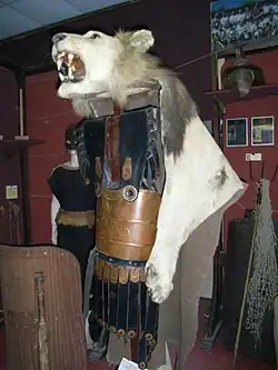 In vielen Darstellungen wird Herakles bzw. Herkules mit einem Löwenfell dargestellt. Der Nemeische Löwe war ein unverwundbares Wesen der griechischen Mythologie. Herakles würgte ihn zu Tode und balgte ihn mit dessen eigenen Krallen ab, denn nur diese waren in der Lage, die Haut des Tieres zu zerschneiden. Später nähte er sich aus dem Fell einen Umhang, der nun ihn fast unverwundbar machte. Nicht nur in der griechischen Sagenwelt trugen beispielsweise die Könige Agamemnon und Diomedes bei öffentlichen Anlässen ein Löwenfell,[5] auch sonst galt es vielerorts als Symbol der Herrscherwürde.