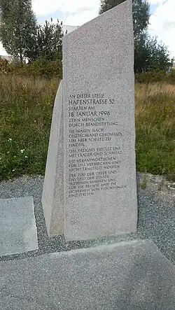 Beim Lübecker Brandanschlag auf ein Haus für Asylbewerber in der Lübecker Hafenstraße starben in der Nacht zum 18. Januar 1996 zehn Menschen (drei Erwachsene und sieben Kinder und Jugendliche). Sie stammten aus Zaire, Angola, Togo und dem Libanon, die jüngsten waren in Deutschland geboren. 38 weitere Hausbewohner wurden verletzt.[2] Das Verbrechen wurde nicht aufgeklärt, die Ermittlungen stehen unter starker öffentlicher Kritik.[3]