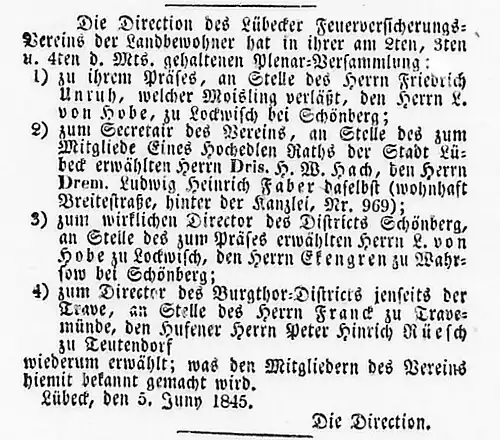 Auf der Plenar-Versammlung Anfang Juni 1845 wird Ludwig von Hobe zu Lockwisch bei Schönberg als Nachfolger von Friedrich Unruh zum Präses gewählt. Direktor der Burgtor-Distrikts wird Peter Hinrich Ruesch zu Teutendorf, Travemünder Winkel.[1]