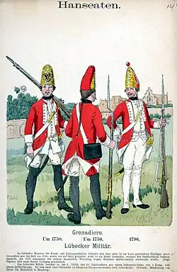 Das eigentliche Lübecker Stadtmilitär war eine reine Infanterietruppe, die sich bis 1750 aus Musketieren zusammensetzte; vorübergehend hatte es von 1713 bis 1718 eine Kompanie Grenadiere gegeben. Erst 1751 wurde erneut eine Grenadierkompanie aufgestellt, die Grenadiermützen mit Vorderschild aus Messingblech erhielt.