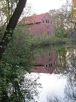 - Etwa 1864 wurde nördlich von Lübtheen an der Chaussee nach Pritzier ein domaniales Erbpachtgehöft mit Windmühle gebaut, das es den Lübtheenern ermöglichte, ihr Korn in kleinen Quantitäten mit der Schubkarre selbst zur nahen Windmühle zu fahren und dort abmahlen zu lassen.[38] Der erste Müller war Fritz Schlie.[39] 1890 war der Lübtheener Kaufmann Carl Schick auf dem Erbmühlengehöft.[40] Die Windmühle war 1912 noch erhalten.[41] 1919 hatte der Müller Ludwig Stiegmann die Mühle.[42] 1925 gab es den Mühlenbetrieb Stiegmann, L. Müllerei, Getreide- und Futtermittelhandlung Lübtheener Mühle.[43] 1928 wird die frühere Stiegmannsche Mühle von einem Ehepaar Lenz gekauft und neu eröffnet. Die Mühle war bis 1946 in Betrieb und wurde Anfang der 1950er Jahre vom Blitz getroffen und abgebrannt. Die Steine wurden für einen Wohnungsneubau nach Schwerin verkauft.[44]