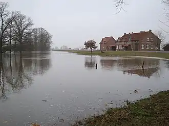 Alte Schule Lütkenwisch beim Elbhochwasser im Januar 2011, elbseitig der Gedenkstein für die Grenzopfer der Elbe und die Einheitseiche