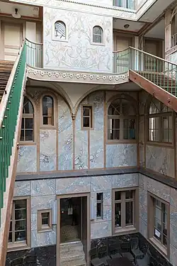 Die Ausrichtung der Wohnungen auf einen geteilten Innenhof sollte diesem Konzept folgend die Arbeiterfamilien moralisch stärken, indem unter anderem mögliches Missverhalten (beispielsweise Alkoholismus oder spätes Nachhausekommen) den anderen Familien bekannt wurde und so eine Art soziale Selbstregulation stattfinden würde. Ob die Bauherren beim Umbau diesem Konzept folgten, ist nicht eindeutig belegt. Deutlich wird jedoch, dass bei der ästhetischen Ausgestaltung des Innenhofs nicht gespart wurde, insbesondere als dieser 1902 erneut umgebaut wurde. Der Trompe-l’œil-Marmor und die feingearbeiteten Einbauten geben dem glasüberdachten Innenhof mit gepflastertem Boden eine besondere Schönheit und machen das von aussen nüchtern wirkende Haus zur Sehenswürdigkeit.[1]