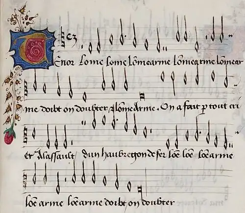 Messen, die meist eine rhythmisch einfache und unverzierte Cantus-firmus-Stimme aufwiesen[5], schufen nach der ersten nachgewiesenen Verwendung[4] in Guillaume Du Fays vierstimmiger Tenormesse, die zugleich zum ersten Mal eine weltliche Melodie als Vorlage nahm[6], zahlreiche Komponisten. Überlieferte Werke stammen von Antoine Brumel, Johannes Ockeghem, Josquin Desprez, Guillaume Faugues, Antoine Busnoys, Pierre de la Rue, Matthaeus Pipelare, Pierre Mouton, Jacob Obrecht, Loyset Compère, Johannes Tinctoris, Costanzo Festa und Francisco Guerrero, in der Spätphase auch von Ludwig Senfl. Zwei Messen, die Missa L’homme armé sexti toni sowie die Missa L’homme armé super voces musicales stammen von Josquin Desprez. Außerhalb des franko-flämischen Kreises griffen auch Robert Carver, Cristóbal de Morales und Francisco Guerriero das Sujet auf.