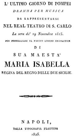 L’ultimo giorno di Pompei (deutsch: Der letzte Tag von Pompeji) ist eine Opera seria (Originalbezeichnung: „dramma per musica“) in zwei Akten von Giovanni Pacini über ein Libretto von Andrea Leone Tottola. In der Uraufführung am 19. November 1825 im Teatro San Carlo in Neapel sangen u. a. die Gesangsstars Adelaide Tosi, Giovanni David, Luigi Lablache und Michele Benedetti.[1] Die Oper erlebte einen glänzenden Erfolg, lief in der Folge an den bedeutendsten Opernhäusern in Europa, wie Mailand, Wien, Paris und Venedig, und inspirierte auch andere Künstler.