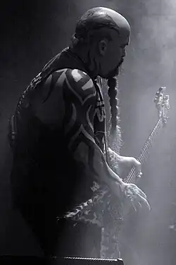 Halford, damals ehemaliger Sänger der Band Judas Priest und aktives Mitglied der vom Industrial Rock beeinflussten Gruppe 2wo, berichtete später über vornehmlich gleichgültige bis positive Reaktionen von Seiten der Anhänger. Halford erklärte, dass den Fans diese Seite seiner Persönlichkeit egal sei und sie ihn „einfach die Songs singen hören und [Judas] Priest sehen“ wollen.[72] Halfords Outing wird im Diskurs um Homosexualität im Metal hervorgehoben, so sei er „[f]ür viele […] mitverantwortlich, dass sich die Heavy-Metal-Szene toleranter gegenüber Homosexualität zeigt.“[73] In der Zeit zwischen Bottums und Halfords Outings traten nur wenige queere Personen in der Metal-Szene in Erscheinung. Zu den bekannteren gehört die von Beginn ihrer Karriere offen bisexuelle Sängerin Deborah Anne „Skin“ Dyer der in der Metal-Szene rezipierten Crossover-Gruppe Skunk Anansie, sowie der Bassist Doug Pinnick von King’s X. Anders als Halford und Skin, welche sich selbst als „schwarze, glatzköpfige, bisexuelle Amazone“ bezeichnet,[74] berichtete Pinnick von diversen Anfeindungen, besonders von Seiten christlicher Organisationen und Fans. Unter anderem kündigte der christlich geprägte Vertrieb Diamante Music Group die Zusammenarbeit mit King’s X in Berufung auf Pinnicks Entscheidung, „einem abstinenten Lebenswandel zu entsagen“.[75] Andere Musiker wie Brian Cook, der Bassist der in den 1990er Jahren langsam populär werdenden Mathcore-Band Botch und der seit der Mitte der 2000er Jahre aktiven Post-Metal-Band Russian Circles, lebten ebenso wie Skin von Beginn seiner Karriere an offen homosexuell ohne besondere mediale Aufmerksamkeit. Demgegenüber inszenierte das homo- und bisexuelle Musikerinnenkollektiv Rockbitch die eigene Sexualität ab 1995 als Teil ihrer Live-Performance und wurde in der Rezeption von Seiten der Musikpresse über die auf der Bühne ausgelebte Sexualität definiert.[76][77][78]