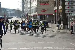 Hamburg-Marathon 2008: Spitzengruppe etwa bei km 14,3 beim Verlassen des Wallringtunnels; im Hintergrund links der Hamburger Hauptbahnhof