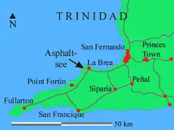 Der See war bereits den spanischen Kolonialherren des 16. Jahrhunderts bekannt, die die Region „Tierra de Brea“ nannten. Walter Raleigh besserte hier 1595 und 1617 Schiffe seiner Expeditionsflotten aus.[6] Zwischen 1617 und 1797 wurde der Ort La Brea gegründet. Der Asphaltsee wurde zu dieser Zeit noch nicht wirtschaftlich genutzt, vielmehr wurden Zucker und Kaffee angebaut. Eine erste Raffinerie für den Asphalt wurde 1792 auf Geheiß des Gouverneurs José María Chacón errichtet. Die kommerzielle Ausbeutung des Asphaltsees begann 1850 durch Thomas Cochrane, der die Nutzungsmöglichkeiten des Asphalts erforschte, was zunächst in ein Patent für den Antrieb von Dampfschiffen durch Verfeuern von Bitumen mündete. Nachdem der deutschstämmige Conrad Stollmeyer in den Betrieb eingestiegen war, konzentrierte man sich auf den Verkauf von Asphalt für den Straßenbau. Ab etwa 1960 flaute das Asphaltgeschäft merklich ab; seit den 2000er-Jahren wird nur noch in geringem Umfang Asphalt abgebaut.