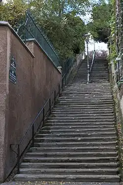 Bevor das Grundstück bebaut werden konnte, musste man es durch Treppenaufgänge erschließen. 1909 wurden die Zugänge geschaffen, die erst 1994 ihre heutigen Namen erhielten: die Rue Mondonville, benannt nach dem Komponisten und Violinisten Jean-Joseph Cassanéa de Mondonville (1711–1872), die Rue Georges-Perec, benannt nach dem Schriftsteller Georges Perec (1936–1982), die Rue du Père-Prosper-Enfantin, benannt nach Barthélemy Prosper Enfantin (1796–1864), Ingenieur, Journalist und Philosoph, und die Rue Camille-Bombois, benannt nach dem Maler Camille Bombois (1883–1970).
