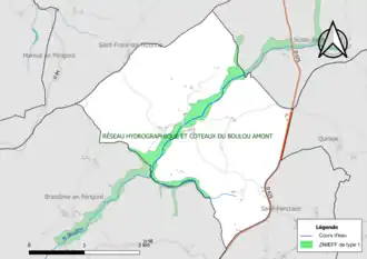 Das Schutzgebiet des Typus 1 bildet jedoch zusammen mit seinem talabwärtigen Pendant Réseau hydrographique et coteaux du Boulou aval (Entwässerungsnetz und Hanglagen des talabwärtigen Boulous) nur ein Teilstück einer weit ausgedehnteren Schutzzone (ZNIEFF des Typus 2), die unter der Bezeichnung Vallée et coteaux du Boulou (Talung und Hanglagen des Boulous) den gesamten Flusslauf des Boulous (inklusive seines linken Nebenflusses an der Südostgrenze des Gemeindegebietes) von seiner Quelle bis zur Mündung in die Dronne umfasst.