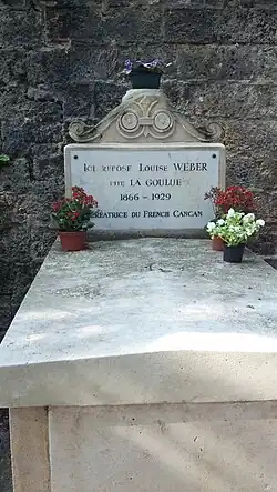 La Goulue lebte danach in einem Schausteller-Wohnwagen im Pariser Vorort Saint-Ouen. Sie starb am 30. Januar 1929 in einem Krankenhaus in Paris. Sie wurde auf dem Cimetière parisien de Pantin beigesetzt.[1] 1991 wurde sie auf Veranlassung des damaligen Pariser Bürgermeisters Jacques Chirac auf den Cimetière de Montmartre (Division 31) umgebettet.[2]