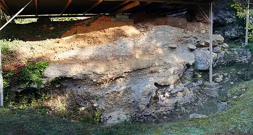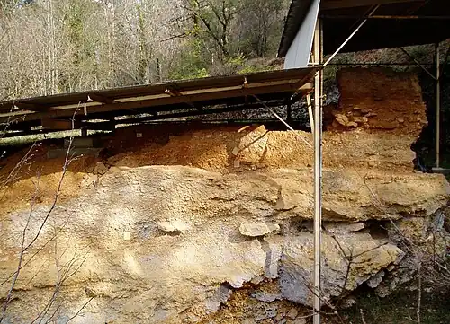 - eine 2,50 Meter mächtige untere Abfolge bestehend aus Geröllen und Schotter. Sie enthält keine archäologischen Überreste und entspricht den von Laville und Rigaud ausgeschiedenen Lagen I bis XII.
