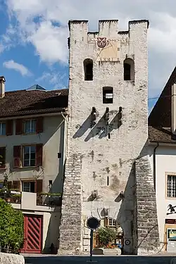 Die Stadtmauer besitzt sieben Türme, die mehrheitlich kurz nach der Stadtgründung 1312 errichtet wurden. Im Südosten befindet sich die Tour de Gléresse (auch Tour Wyss), gegen den See die Tour de Rive, im Südwesten die Tour Baillif, die Tour Hildebrant, die Tour Jaggi im Nordwesten und im Norden die Tour Rouge (Zytgloggeturm), die 1592–1596 verändert wurde. Der massive Bau der Tour Carrée (auch Tour des Cloches) nordöstlich der Altstadt entstand erst 1520.