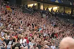 1987 „schwappte“ La Ola auch nach Deutschland über: Beim Eishockey-Bundesligisten ESV Kaufbeuren wurde im Spiel gegen den Kölner EC erstmals die „Welle“ durch den Stadionsprecher angestimmt. Sie rollte über zehnmal durch das ausverkaufte Stadion.