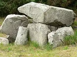 Die megalithische Kiste/Kammer auf der Westseite besteht aus sieben aufrechten Steinen und einem aufliegenden Deckstein. Der heutige Grundriss ist jedoch irreführend, da die ursprüngliche Ordnung gestört wurde. Ursprünglich scheint es eine polygonale Steinkiste gewesen zu sein. Sie ist von einem Rundhügel von etwa 5,0 m Durchmesser mit einem Rand aus Platten und Felsen umgeben. Das Layout des Typs ist als „cist-in-circle“-Denkmal bekannt. An der Seite des nördlichen Steines befindet sich als außergewöhnliches Merkmal eine gebogene Reihe von zwölf Schälchen, von denen sieben sichtbar sind; die anderen liegen im Boden. Das zeigt, dass dieser Stein, einst vermutlich der zweite Deckstein, vor Jahren an die falsche Stelle versetzt wurde. Die Schälchen bilden (abgesehen von einer Figur, die auf dem Deckstein von Le Dehus) das einzige Beispiel für Petroglyphen auf der Insel.