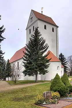 - die aus dem 12. Jahrhundert stammende romanische Chorturmkirche, ein verputzter Bruchsteinbau mit einem eingezogenen wehrhaften, querrechteckigen Chorturm. Die Apsis trägt romanische Fenster im Osten, der Saal ist mit Korbbogenfenstern ausgestattet, die Sakristei an der Nordseite hat einen Zugang zum Beinhaus.