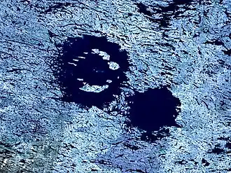 Die beiden Teilseen füllen kreisförmige Depressionen, welche beide als Impaktkrater verifiziert wurden.[7] Der östliche Krater hat einen Durchmesser von 26 km, der westliche Krater von mindestens 36 km.[8][9] Bis vor kurzem galten beide Krater als gleich alt, 290 ± 20 Millionen Jahre (Perm) und es wurde seit 1965 allgemein angenommen, dass sie im Zuge des Einschlags eines Doppelasteroiden gleichzeitig entstanden. Neuere Altersdatierungen an Impaktiten beider Krater mittels der Argon-Argon-Datierung ergaben jedoch deutlich unterschiedliche geologische Alter. Der westliche Krater ist demnach 286,2 ± 2,6 Millionen Jahre alt (frühes Perm), der östliche Krater hat dagegen ein Alter von 460–470 Millionen Jahren (Ordovizium).[10] Zudem sind auch die Zusammensetzung der jeweiligen Impaktgesteine, deren geophysikalische Eigenschaften (Natürliche Remanenz) sowie der geochemische Fingerabdruck der jeweiligen Meteoriten für beide Impaktkrater unterschiedlich. Die Clearwater-Krater bilden daher, wie auch die beiden kleineren Suvasvesi-Krater in Finnland, ein nur scheinbares Impaktkraterpaar.