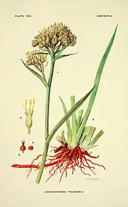 - ↑ a b c d e f g h i j k l m n o p Kenneth R. Robertson: Haemodoraceae. In: Flora of North America Editorial Committee (Hrsg.): Flora of North America North of Mexico. Volume 26: Magnoliophyta: Liliidae: Liliales and Orchidales, Oxford University Press, New York und Oxford, 2002, ISBN 0-19-515208-5: Lachnanthes Elliott und Lachnanthes caroliniana (Lamarck) Dandy. S. 48 – textgleich online wie gedrucktes Werk.
