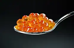 Lachskaviar oder Lachsrogen, seltener auch Roter Kaviar, ist ein Nahrungsmittel, das aus den gereinigten und behandelten Eiern von Lachsfischen hergestellt wird. Lachskaviar ist ein Bestandteil der russischen und japanischen Küche.[1][2]