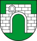 Blasonierung: „In Grün eine silberne durchgehende Mauer mit Aufsatz über dem offenen Tor, im Aufsatz rechts eine Rundbogennische.“ |