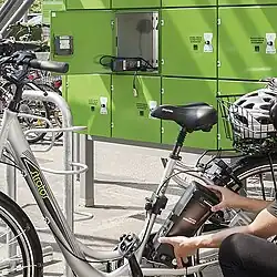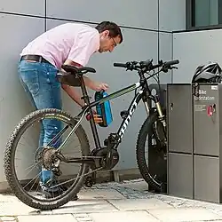 Vorteilhafterweise sollten die Schließfachtüren eine kleine Aussparung o. ä. aufweisen, damit ein Ladekabel ohne Quetschgefahr durch die verschlossene Tür zum Fahrrad geführt werden kann (Laden von im Rahmen eingebauten Akkus). Die integrierten Fahrradhalterungen sollten dem Fahrrad gute Standsicherheit und Diebstahlschutz bieten. Daher sollte es sich bei den Halterungen mindestens um Anlehnbügel[7] mit Knieholm, besser noch um ADFC-zertifizierte[8] oder DIN79008[9]-konforme Modelle handeln. Bei Reihenanlagen sollte ein Mindestabstand von 70 cm zwischen den Fahrrädern eingehalten werden, da die Nutzer zwischen die Fahrräder treten können müssen.