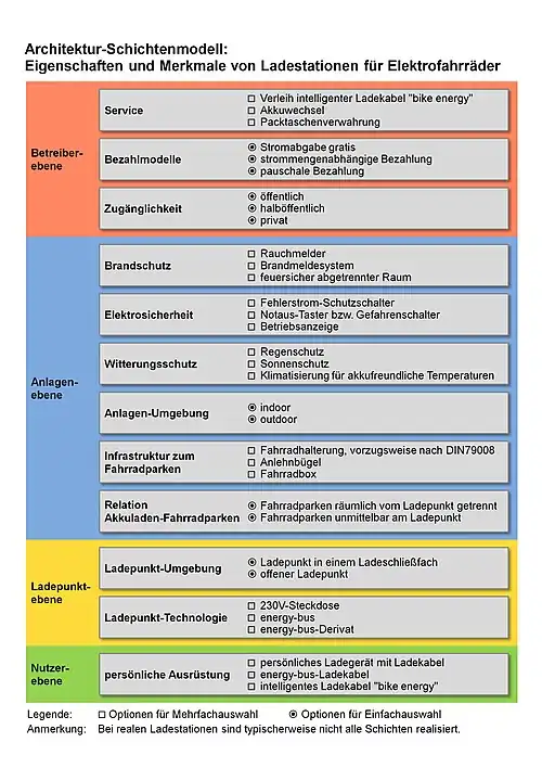 Diese unterschiedlichen Randbedingungen bedingen, dass sich die Ladestationen für Elektrofahrräder und für Elektroautos in der Regel technologisch und konstruktiv deutlich voneinander unterscheiden (sollten). Das oben dargestellte Schichtenmodell beschreibt die grundsätzliche Architektur von E-Bike-Ladestationen, wobei in realen Anlagen nicht jede Schicht realisiert sein muss. Die Eigenschaften einer Anlage werden dabei im Wesentlichen bestimmt durch die drei Faktoren Ladetechnologie, Bauart und Installationsumgebung (indoor/outdoor). Im Detail sollten bei einer fachgerechten E-Bike-Lade-Infrastruktur die folgenden grundlegenden Anforderungen berücksichtigt sein: