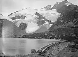 1910–1911 wurden die beiden Gewichtsstaumauern Scala (Südseite) und Arlas (Nordseite, aus drei Bögen bestehend) errichtet, so dass sich ein Stausee mit einem Volumen von 18,6 Mio. m³ bildete.