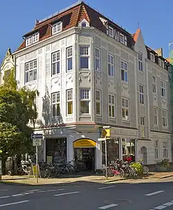 - Nach Nr. 12 Ecke Langemarckstraße 141: 3-gesch. verklinkertes Wohn- und Geschäftshaus mit prägendem Erkertürmchen an der Ecke
