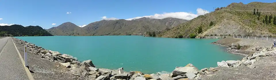 Der Lake Benmore ist mit einer Fläche von 74,5 km2 und eine Uferlänge von 116 km der größte von Menschen erstellte See in Neuseeland und misst als Größenvergleich das 1,5-fache Wasservolumen des Wellington Harbour.[8]