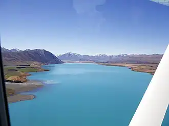 | Lake Tekapo, Luftbildaufnahme mit Blick von Nordosten auf den See | ||
