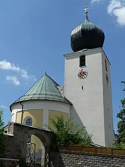 - Die katholische Pfarrkirche St. Ulrich wurde nach dem großen Ortsbrand von 1699 unter Einbeziehung des gotischen Turmes bis 1765 wieder aufgebaut. Die reichhaltige barocke Ausstattung aus der Zeit um 1750 erhielt im 20. Jahrhundert Ergänzungen. In der Friedhofsmauer befinden sich Nischengräber mit Heiligenstatuen. Anfang der 1990er Jahre wurde die Kirche renoviert, dabei wurde u. a. die doppelstöckige Orgelempore durch eine einfache ersetzt.