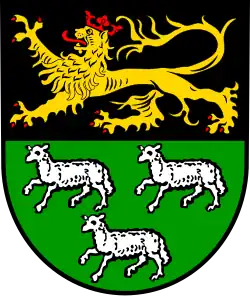 Blasonierung: „Von Schwarz und Grün geteilt, oben ein rotbewehrter, -bezungter und -bekrönter goldener Löwe, unten drei silberne Lämmer.“[13] |