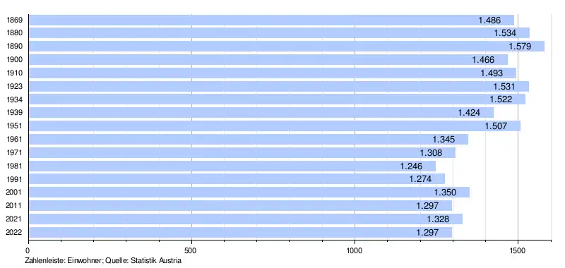 1991 hatte die Gemeinde laut Volkszählung 1.274 Einwohner, bis 2001 nahm die Bevölkerung trotz negativer Wanderungsbilanz (−19) wegen der positiven Geburtenbilanz (+95) auf 1.350 Einwohner zu. Im folgenden Jahrzehnt wurde die Abwanderung stärker, sodass die Einwohnerzahl auf 1.297 Personen im Jahr 2011 zurückging.[8]