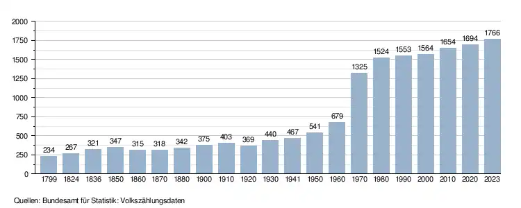 - ↑ Daten der Eidgenössischen Volkszählungen ab 1850 nach Gemeinden. (XLSX; 10 MB) Bundesamt für Statistik, Neuchâtel, 12. Juli 2024, abgerufen am 14. April 2025 (Öffnung in Excel nur über "Anhang/Excel-Datensatz" möglich).
