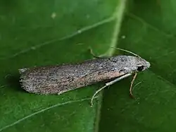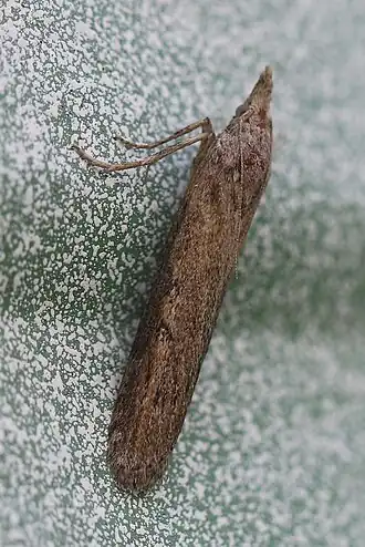 Die Schmetterlinge weisen eine Flügelspannweite von 20–37 mm auf.[4] Die Falter sind graubraun gefärbt. Die Vorderflügel weisen in der vorderen Flügelhälfte zwei dunkle Flecke auf. Die hintere Flügelhälfte ist mit dunklen Pigmenten übersät. In der Postdiskalregion verlaufen dunkle Längsstreifen. Die cremefarbenen Hinterflügel sind ohne Musterung. Die Männchen sind wesentlich kleiner als die Weibchen.[4] Die Raupen sind dunkelbraun bis schwarz gefärbt und besitzen eine braune Kopfkapsel.[1]