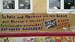 In der Nacht auf den 26. November warfen Unbekannte in den Stadtteilen Eimsbüttel, Altona und Wandsbek Steine und Farbbeutel auf die Häuser, in denen der SPD-Fraktionschef Andreas Dressel, der Sozialstaatsrat Jan Pörksen und der Baustaatsrat Michael Sachs wohnen. Zudem wurden Autoreifen zerstochen. In einem Bekennerschreiben hieß es laut dem Hamburger Abendblatt, dass die Politiker in unterschiedlicher Weise mit der Unterbringung der Flüchtlinge zu tun hätten.[78] Die Hamburger Morgenpost gab bekannt, dass sie eine E-Mail mit dem Motto „Krieg, Flucht, Entrechtung: Genug ist genug“ und dem Satz „Menschen sterben und ihr schweigt, Scheiben klirren und ihr schreit“, bekommen habe.[79]