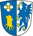 Blasonierung: „Gespalten von Blau und Silber; vorne über einem bewurzelten goldenen Baumstumpf eine silberne Rose mit goldenem Butzen und goldenen Kelchblättern, hinten ein goldenbewehrter blauer Greif.“[27] |