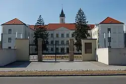 Die dreigeschoßige doppelflügelige Anlage hat einen stark zurückgenommenen 13-achsigen Mittelteil. Die Fassade hat eine schlichte Gliederung mit Kolossalpilastern mit einem flachen Giebelaufsatz und einem Glockenturm aus 1912.