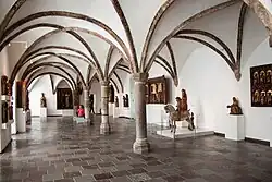 Die aus dem späten 15. Jahrhundert stammende Gotische Halle zeigt sakrale Kunst (Altäre und kirchliche Skulpturen des 13. bis 15. Jahrhunderts). Wichtige Objekte sind unter anderem der Landkirchener Altar (um 1380), ein bemalter Altarflügel (1480), ein übergroßes Kruzifix (um 1500) und ein staufischer Messkelch aus dem 13. Jahrhundert.[6] In weiteren Räumen werden Exponate zu folgenden Themen gezeigt: Kunst und Kultur des Mittelalters, Kunst und Kultur der Renaissance,[7] Klassizismus[8] und Biedermeier, Galerie des 19. Jahrhunderts[9] und Geschichte des Schlosses und eine Sonderfläche.