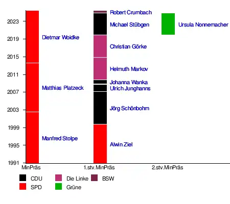 | 20. November 2019 – 22. November 2024 | Kabinett Woidke III | SPD, CDU, Bündnis 90/Die Grünen | ||