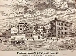 - Nach dem Ersten Weltkrieg und dem Zerfall Österreich-Ungarns als Preßburg anhand des Friedensvertrags von Trianon von Ungarn abgetrennt wurde, geriet das Krankenhaus unter die Herrschaft der Behörden der neu gegründeten Tschechoslowakei. Auch in dieser Zwischenkriegszeit war es die größte Anstalt der Stadt.