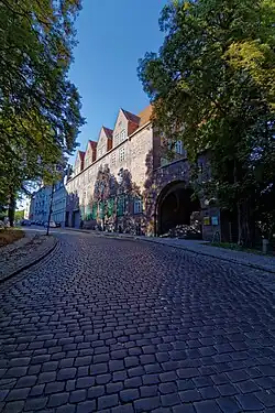 Die zwei Giebel rechts gehören zum Landeszentralbankgebäude. (Rechts: backsteinerne Gebäudeteile des Alten Gymnasiums.)