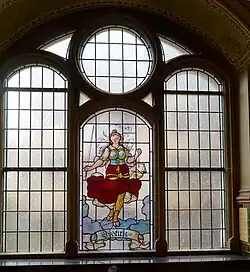 Im Inneren des Gebäudes ist im Treppenhaus ein großes, farbig verglastes Fenster mit einer Darstellung der Justitia zu sehen. Auch dieses war in der Zeit der nationalsozialistischen Herrschaft entfernt worden. Grund hierfür waren die verbundenen Augen der Justitia, womit symbolisiert wird, dass die Gerechtigkeit ohne Ansehen der Person urteilt. Nach dem Krieg konnte auch dieses Glasbild wieder eingesetzt werden. Weiter hervorzuheben ist der Schwurgerichtssaal mit seinem reichen Schmuck.