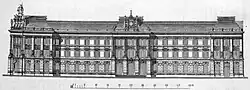 Der Portikus zur Pillnitzer Straße war als dreiachsiger Mittelrisalit gestaltet. Über dem Erdgeschoss mit drei Rundbogenportalen erhoben sich vier doppelgeschossige kannelierte Säulen mit Kapitellen in Kolossalordnung. Darauf stützte sich ein Architrav mit Giebelaufbau. In der Mitte des Giebels befand sich das sächsische Wappen mit Rautenkrone.[1][2]