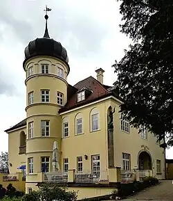 Der zweigeschossige putzgegliederte Walmdachbau in historisierenden Formen mit Zwiebelturm und Loggien ist der bedeutendste Villenbau in der Gemeinde. Er hat einen repräsentativen Eingang mit einer breiten, korbbogigen Öffnung im Osten und einen Rundturm vor der Südfront mit Zwiebelhaube.