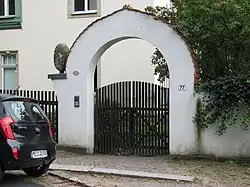 Die Einfriedung ist ein grüner Holzzaun zwischen Pfeilern mit einer Ziegeldeckung in Form eines Satteldaches. Das gemauerte und verputzte Eingangstor ist rundbogig, darin ein zweiflügliges und segmentbogiges Lattentor. Dieses wurde wie der Zaun nach 1995 erneuert. Außen ist der Torbogen mit roten Biberschwanzziegeln wie die Zaunpfeiler gedeckt, einschließlich entsprechender Firstziegel. Während sich rechts des Torbogens eine schlichte Putzmauer mit Sandsteinplatten-Abdeckung anschließt, kommt auf der linken Seite eine Konsole hervor, auf der sich ein Sandstein-Ellipsoid befindet.[3]