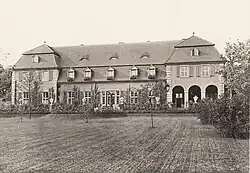 Als Folge des Kriegs waren 1945 zahlreiche Krankenhäuser in Berlin beschädigt oder zerstört. Der Verlust an Bettenkapazität gegenüber der Vorkriegszeit bewegte sich zwischen 70 und 90 Prozent.[24] Abhilfe fand sich unter anderem in den seit Kriegsende und dem Zusammenbruch des NS-Staats leerstehenden Gebäuden am Wannsee. Bereits im August 1945 eröffnete als Behelfslösung das Städtische Krankenhaus Wannsee mit 335 Betten, verteilt über mehreren Villen in der Straße Am Großen Wannsee, darunter die Villa Liebermann, das Haus Hamspohn und das Landhaus Oppenheim. Zunächst beherbergte es die Gynäkologie-Abteilung, später wurde es zur Röntgenstation mit einer Verbrennungsanlage für Krankenhausabfälle aller Art im Keller.[25] Dieses Provisorium bestand bis 1970.[25] Fotografien aus der Nachkriegszeit zeigen die Nutzung der Baracken aus der NS-Zeit für das Krankenhaus[26] und den weitgehend verwilderten Garten.[27]