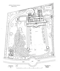 Das Landhaus platzierte Messel auf dem hinteren, straßenabgewandten Teil der Parzelle. Vom Pförtnerhaus an der Großen Seestraße führte ein Fahrweg am südlichen Rand des Grundstücks zu einem Rondell hinter dem Landhaus. Eine dichte Baumfläche, mit deren Anpflanzung unmittelbar nach Erwerb des Grundstücks begonnen wurde, verbarg die Sicht auf Pförtnerhaus und Erschließungsweg vom Haupthaus. Das nur mit niedrigen Nebengebäuden bebaute Seegrundstück auf der gegenüberliegenden Straßenseite sicherte den freien Blick vom Haupthaus über die Pleasureground-artige Rasenfläche auf den Wannsee. Durch die Neuparzellierung der Grundstücke, Abriss der Nebengebäude und die Neubebauung ist diese Gestaltung heute verloren.