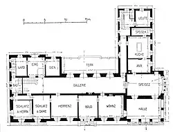 Durch den Haupteingang gelangt man in einen quadratischen Vorraum, an den sich rechts die Garderobe und links das ehemalige Dienerzimmer anschließen. Danach folgt die Galerie, die anstelle einer traditionellen Halle oder Diele die anschließenden Wohnräume erschließt. Mit ihrer Breite von 3,8 m und einer Länge von nahezu 27 m ist sie der größte Raum des Hauses und beherrscht es auf der Eingangsseite. Den Boden bedecken schwarze und weiße, in einem diagonalen Schachbrettmuster verlegte Marmorplatten. Vier große Fenster, von denen sich die beiden mittleren auf die vorgelagerte Terrasse an der Rückfront öffnen lassen, erleuchten die Galerie. Vier rötliche Stuckmarmor-Säulen bei den Fenstern unterteilen den Raum in einen eher repräsentativeren Teil gegen das an der nördlichen Schmalseite gewissermaßen als Verlängerung der Galerie anschließende Speisezimmer und einen eher auf den Eingang und das Treppenhaus an der südlichen Schmalseite bezogenen Teil. Die Tür am Ende der Galerie rechts vom Speisezimmer verbindet zu den Wirtschaftsräumen wie Küche, Speisekammer und Anrichte. Der Wirtschaftstrakt besitzt einen gesonderten Eingang an der Westseite.