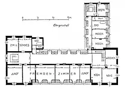 Das Volumen des Haupthauses teilte Messel in einen Haupttrakt und einen eingeschossigen kleinen Vorbau auf der Nordseite, der Wirtschaftsräume wie Küche, Vorratskammer, Anrichte und im Dachgeschoss Zimmer für Dienstmädchen aufnahm. Im Kellergeschoss brachte er neben weiteren Vorratsräumen auch die Zentralheizung für das Haus unter.